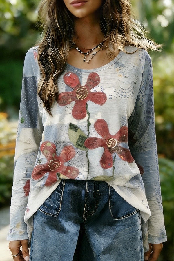 Express your artistic side with this unique floral print color-block top. Featuring hand-painted style red flowers with gold spiral centers, abstract watercolor patches in blue and cream, and color-blocked sleeves, this one-of-a-kind piece brings bohemian artistry and creative flair to your wardrobe.