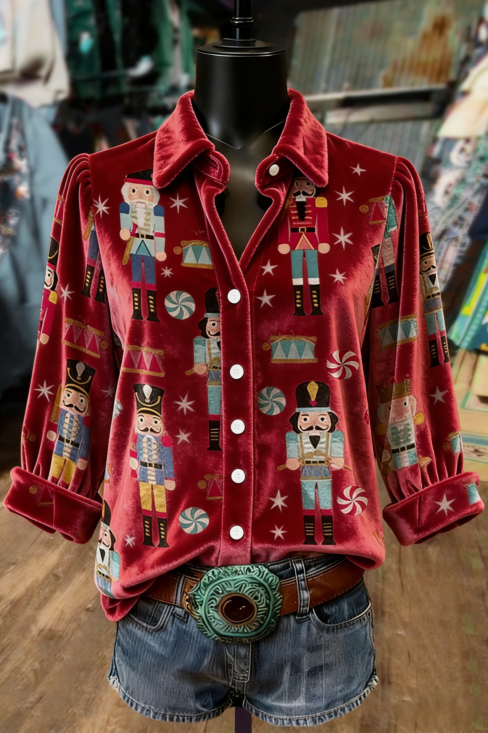 Christmas Nutcracker Print Print Collared Velvet Top