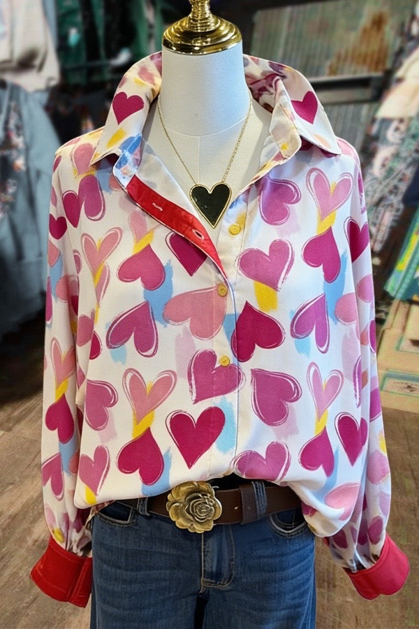 Colorful Art Print Red Puff Long Sleeve Blouse