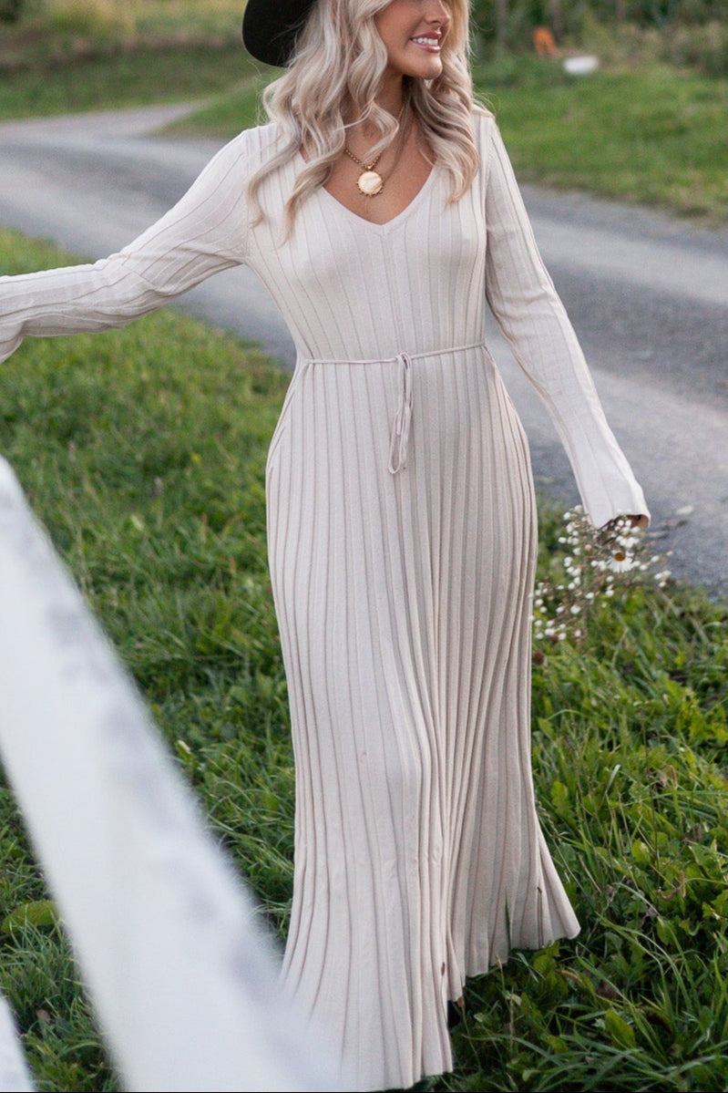 This Ribbed Knit Maxi Dress offers effortless elegance with its soft ribbed knit fabric and flattering V-neckline. It cinches at the waist with a tie for a flattering silhouette. The maxi length makes it perfect for both casual and formal occasions.