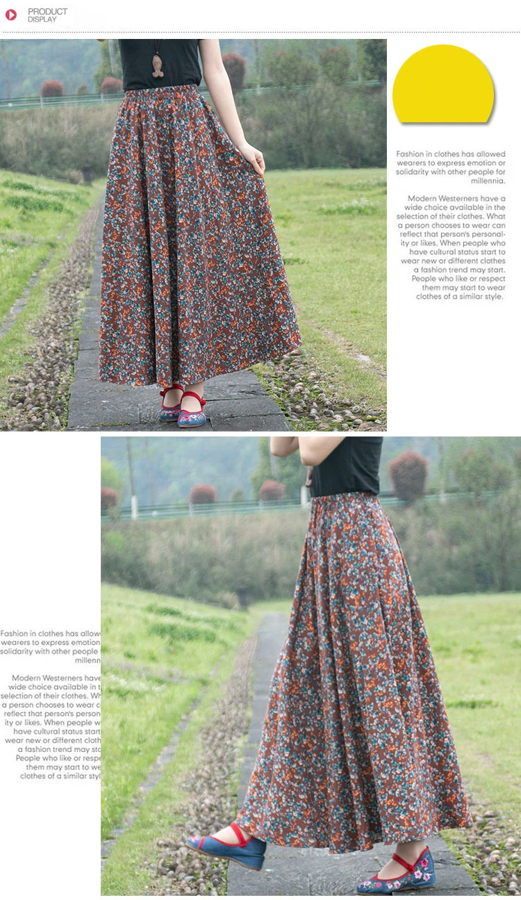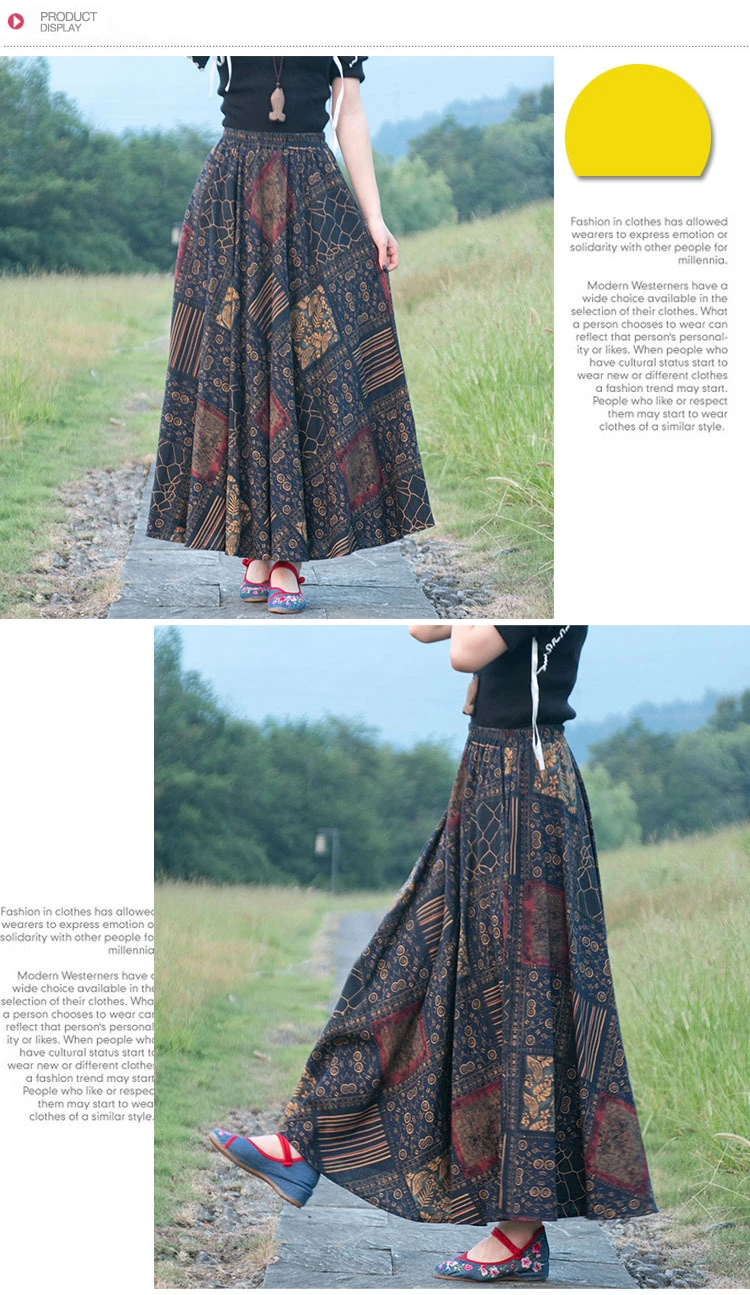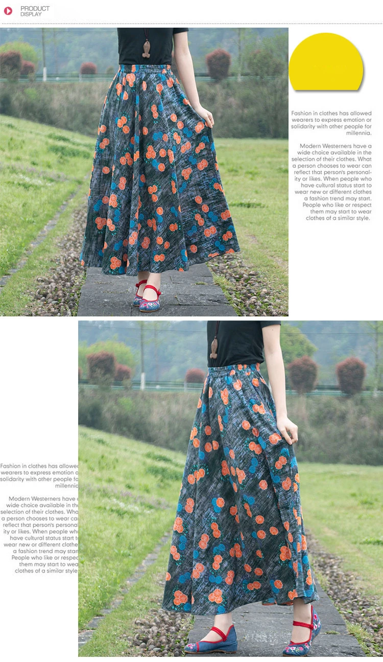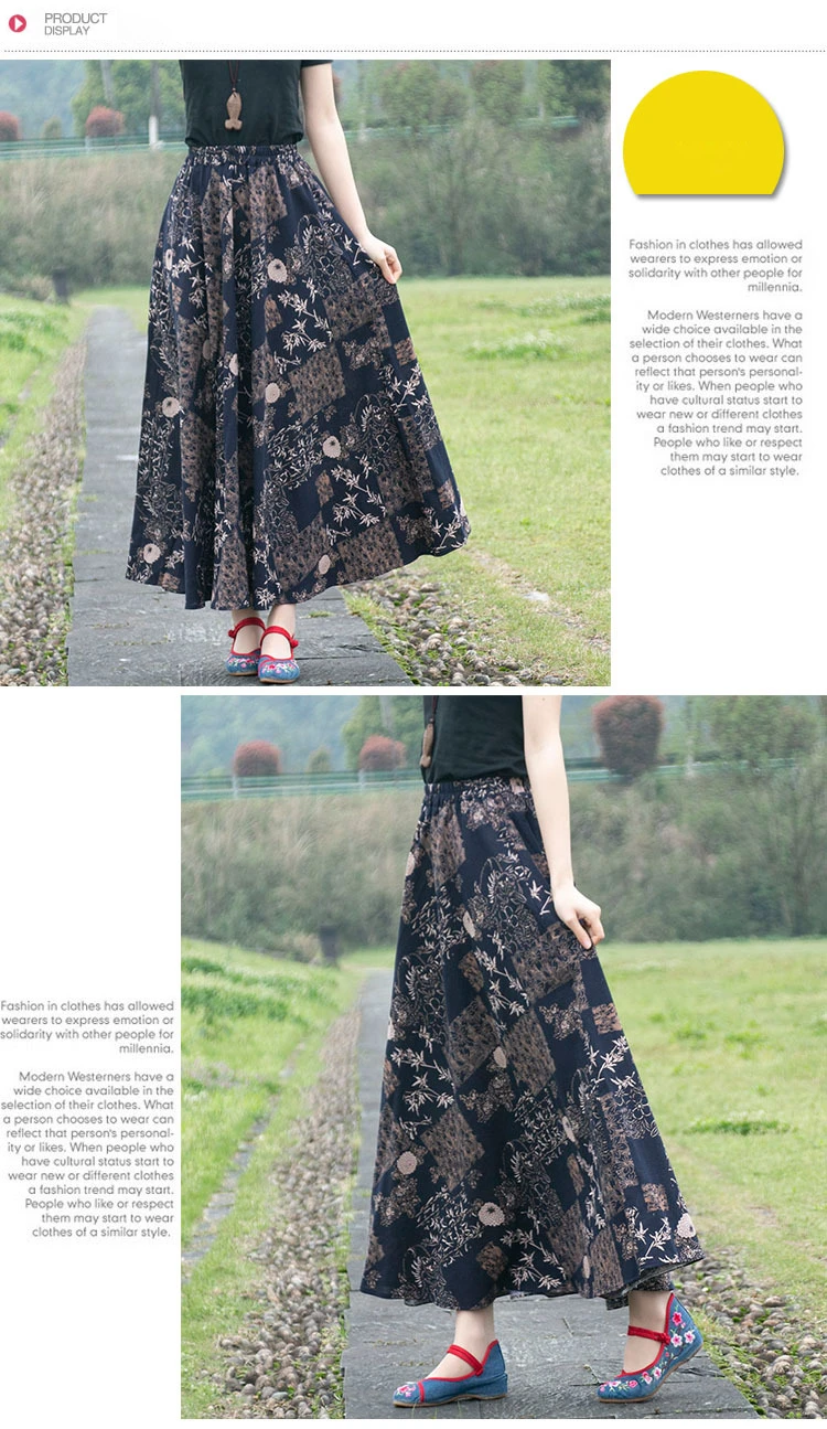 Cotton and linen printed maxi skirt | Retro ethnic style elastic waist midi skirt