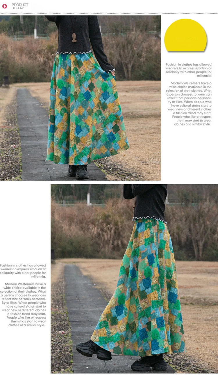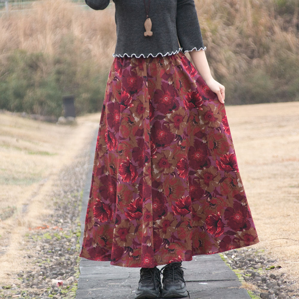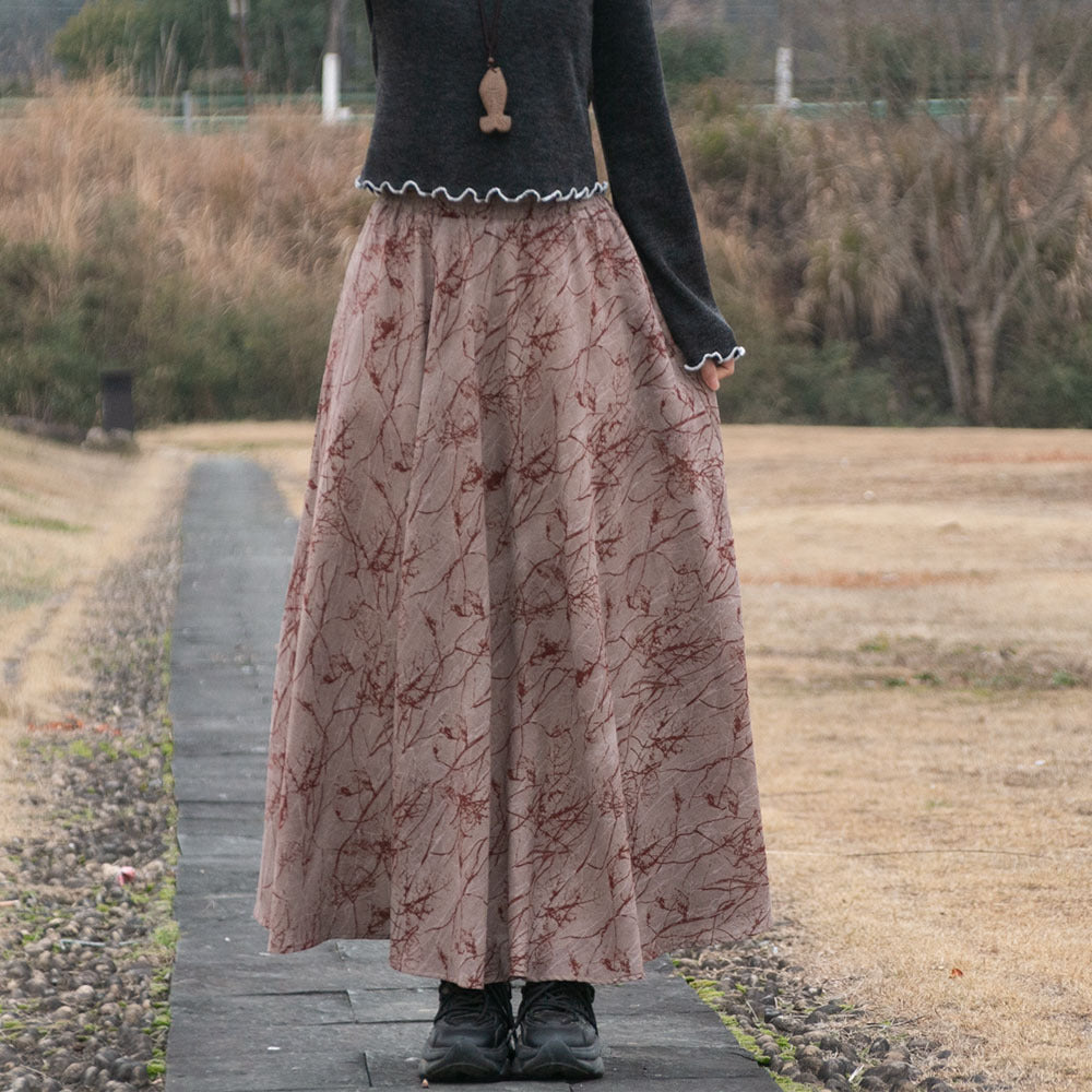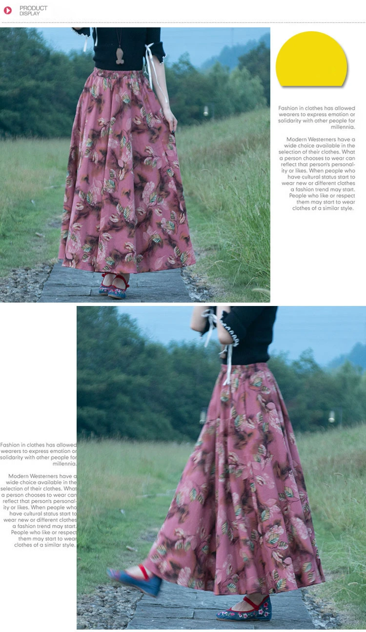 Cotton and linen printed maxi skirt | Retro ethnic style elastic waist midi skirt