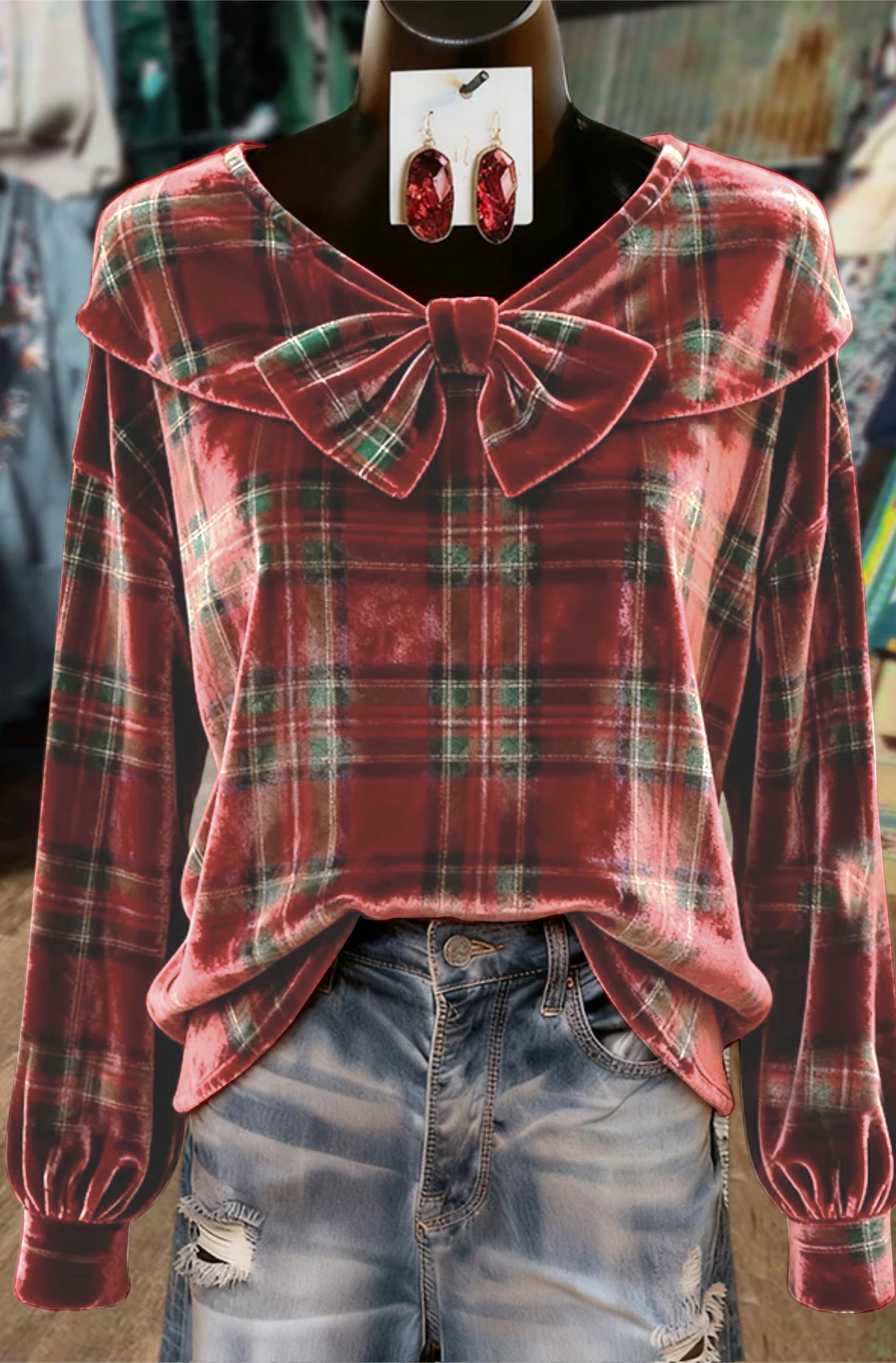 Holiday Plaid Bow Detailed Long Sleeve Velvet Top