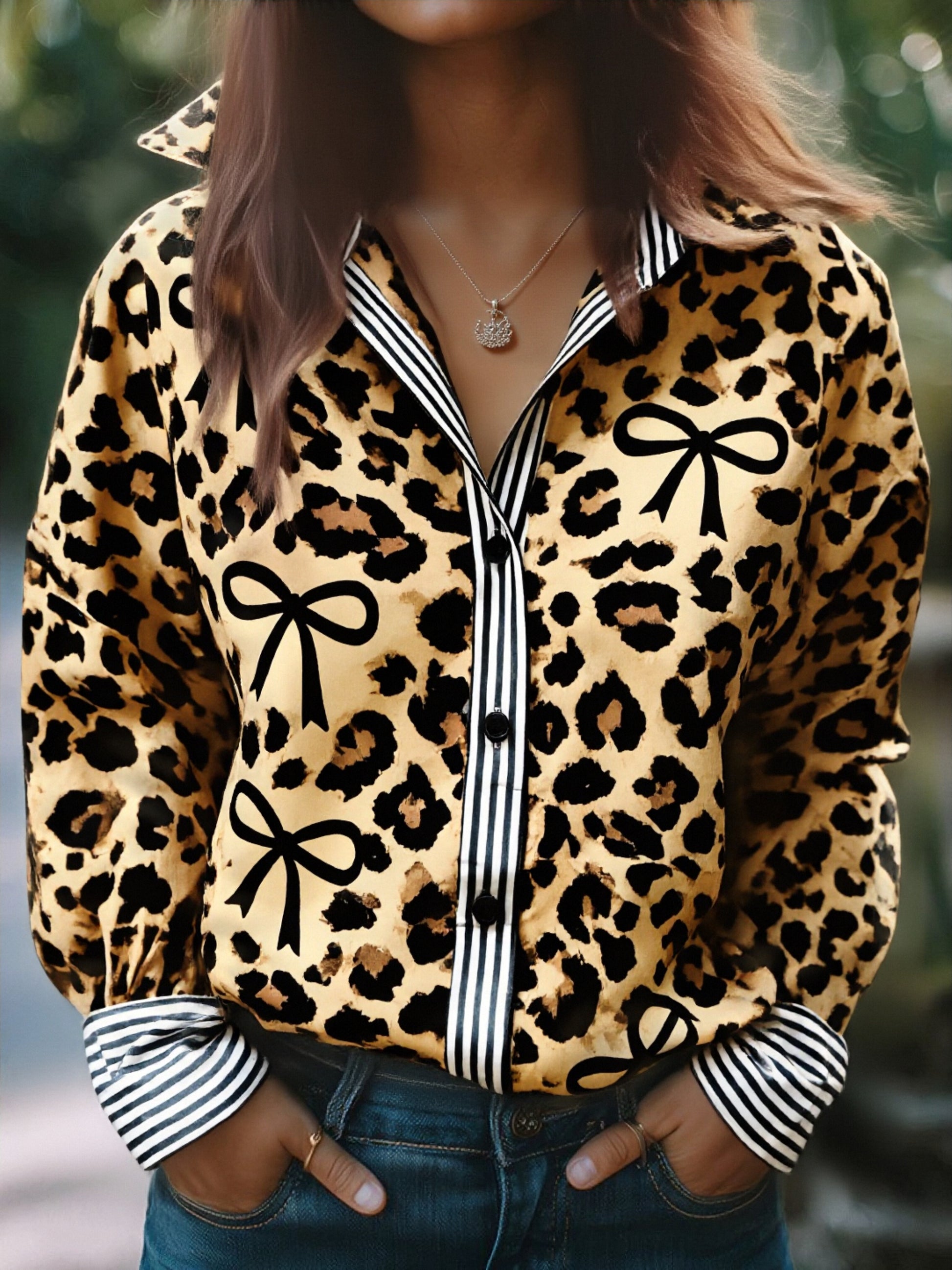 Leopard Bow Print Striped Collar Long Sleeve Blouse