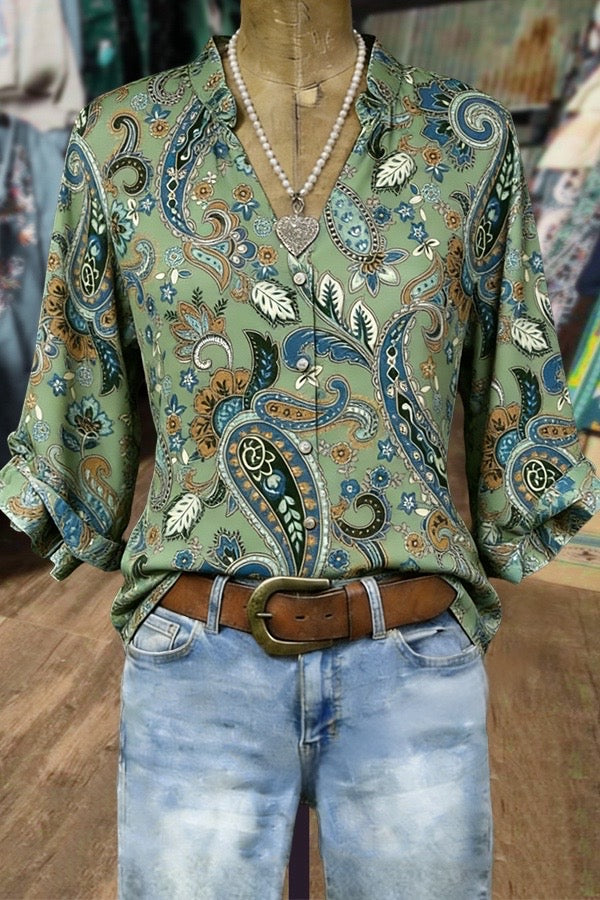 Paisley Floral Print Split Neck Three Quater Dolman Sleeves Blouse