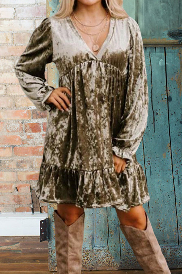Vintage Velvet Balloon Sleeve Pleated V-Neck Dress