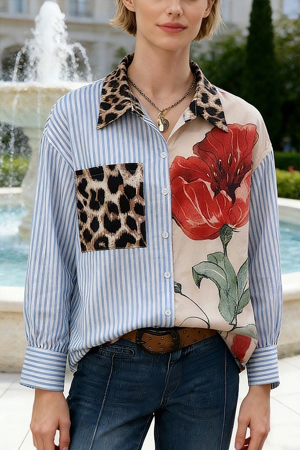 Make a fearless fashion statement with this unique mixed-pattern button-down shirt. Featuring blue and white stripes, bold leopard print accents, and a stunning red floral design, this eye-catching piece brings contemporary pattern-mixing and artistic flair to your wardrobe.