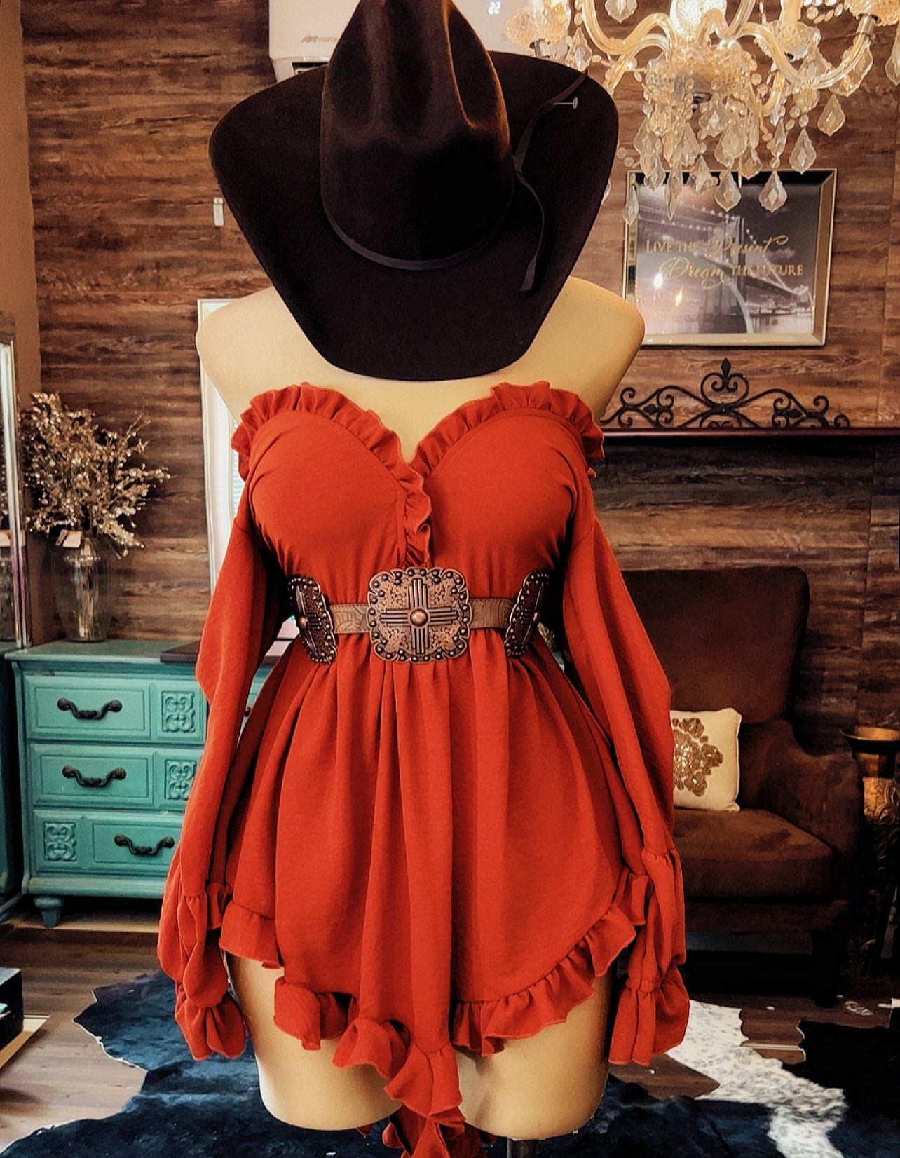 Step into Southern charm with this fiery rust-red off-shoulder dress, designed with dramatic ruffle detailing and a cascading high-low hem. Paired with a statement vintage-style belt, this dress adds instant Western flair to your wardrobe. Perfect for rodeo nights, music festivals, or Western-themed events. Style with tall cowboy boots and a wide-brim hat for a show-stopping outfit.