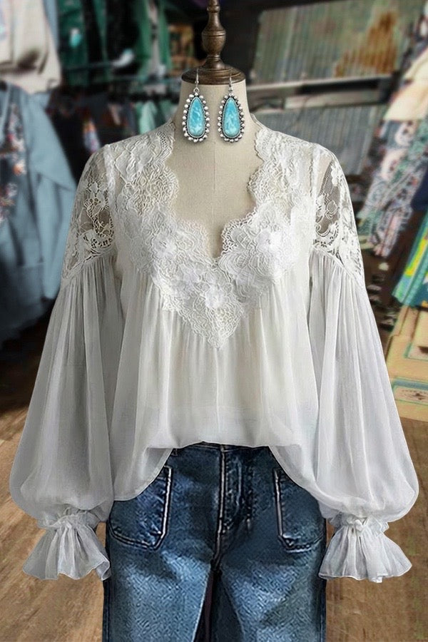 Embrace romantic bohemian elegance with this stunning white lace peasant blouse. Featuring exquisite floral lace detailing on the bodice and shoulders, dramatic balloon sleeves with ruffle cuffs, this ethereal piece is perfect for creating dreamy, feminine looks.