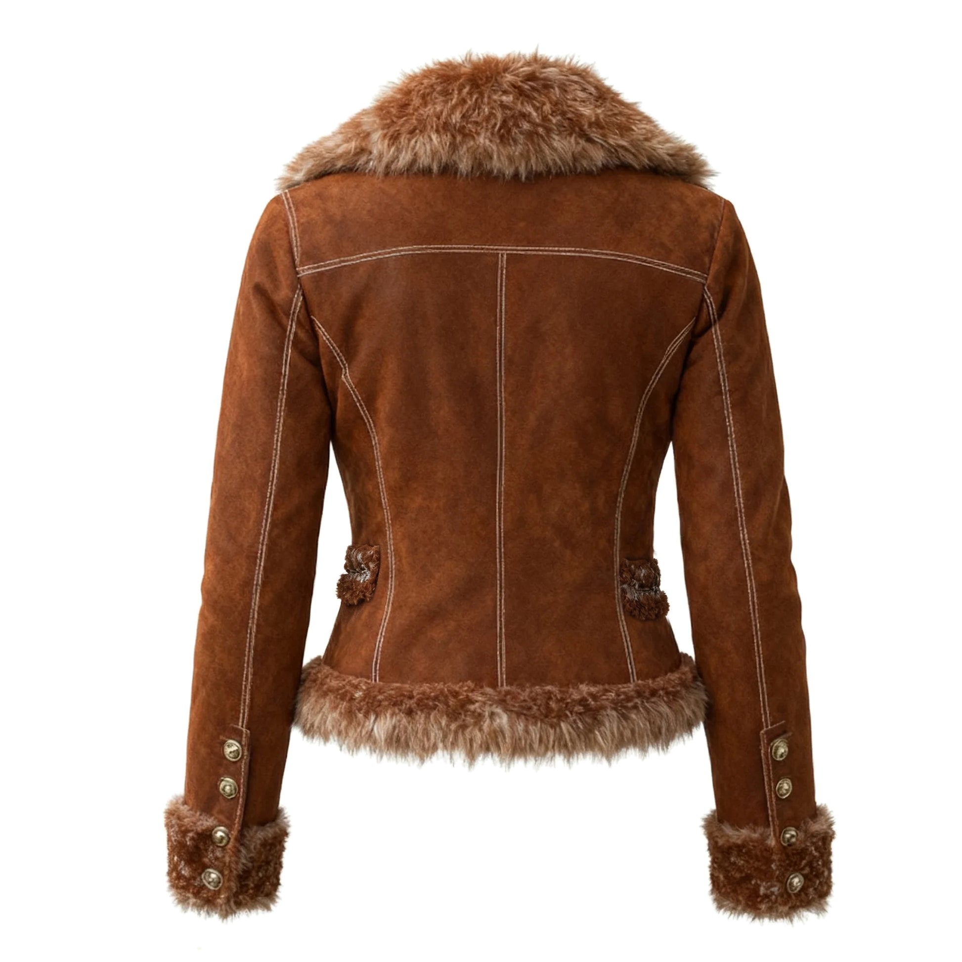 • Design Elements: Double-breasted front with decorative buttons, shearling trim at the collar, cuffs, and hem