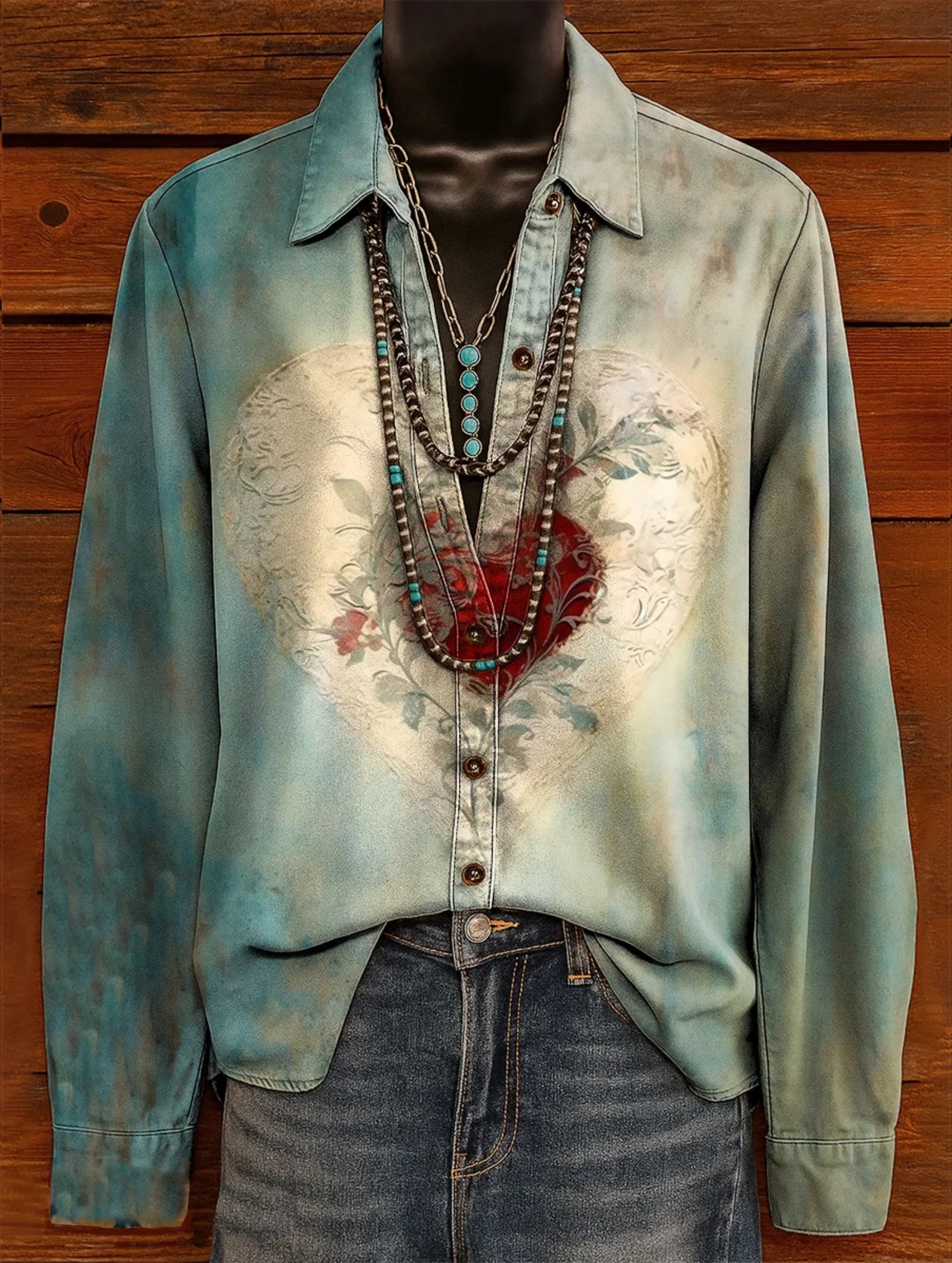 Women's Vintage Heart Pattern Art Print Casual Cotton Shirt